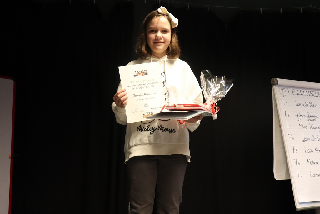 Auch in diesem Jahr haben wir an der Ernst-Haeckel-Schule das erste Halbjahr mit dem Lesewettbewerb des 7. Jahrgangs ausklingen lassen. Die Teilnehmer und Teilnehmerinnen haben sich einen anspruchsvollen Wettkampf mit ihren eigenen und fremden Texten geliefert. Wir gratulieren Hannah Nobis aus der Klasse 7/1, die von der Jury, unter der Leitung des Schuldirektors Herrn Roloff, zur Siegerin gewählt wurde. Wir bedanken uns bei allen Teilnehmerinnen und Teilnehmern des Lesewettbewerbs sowie bei dem Leistungskurs Deutsch des 12. Jahrgangs für die Durchführung. Ein großer Dank geht zudem an die Elternvertreterinnen Frau Ahlrep und Frau Marschall, die die Jury tatkräftig unterstützten.